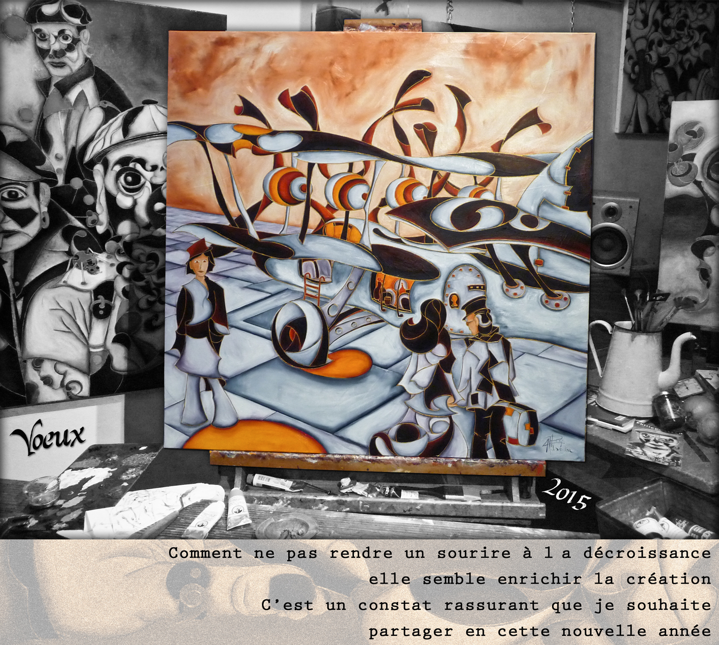 1. Un magnifique travail pour cette carte de voeux 2015, avec le pari de nouvelles harmonies colorées, douces, raffinées et subtiles et toujours la même invitation à voyager au coeur de nos rêves; merci pour ce voyage, l’aventure est belle